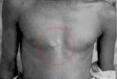 下面還有一個這樣的案例,還有照片給大家看看,這個案例也是史蒂芬森教授研究的一個例子,是在印度,有一個男孩,這個男孩從小就能夠記憶自己的前世,他說自己前生就叫馬哈,一個男子,這個男子是跟他生活在同一個村莊的,結果這個男子後來被一個職業殺手給殺死,被人謀殺,那個殺手是用手槍對準他的胸口近距離把他槍殺,所以子彈從他的胸口穿入。結果史蒂芬森教授對這男孩進行調查,證實以後,還找到前世這個死者所在的一家政府醫院,最後臨死時候的這家醫院,在醫院裡找到屍體的解剖圖,法醫所畫的圖。這個圖就是右邊這幅圖,胸膛中間是傷口的位置,左邊這幅圖是這個小男孩這一生的照片。你看他的胸膛確實有一處這樣的胎記,他胎記的形狀、位置真的跟他的前生子彈打入傷口的位置很符合。