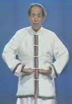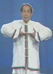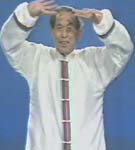 動作:呼氣念嘻字,足四、五趾點地,隨即放開。兩手如捧物狀由體側向恥骨處抬起(圖39),手心朝上,指尖相對,提至膻中穴(圖40)。然後兩臂外旋翻轉,手心向外,並向頭部托舉,兩手心轉向上,指尖相對(圖41)。吸氣時,兩臂內旋,兩手五指分開由頭部循膽經路線而下(圖42),拇指經過風池,其餘四指過面部,兩手再厲淵腋(圖43)、日月至環跳(圖44),自然垂於體側,以意送至足四趾端之竅陰穴。然後,兩手重疊,覆于下丹田,稍事休息。再重複做,共做六次,調息,恢復預備式。