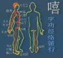 讀嘻字時,以意領氣,由足竅陰、至陰上踝入膀胱經,由小腹處上升,曆絡下、中、上三焦至胸中,轉注心包經,由天池、天泉而曲澤、大陵至勞宮穴,別入三焦經。吸氣時即由手第四指端關沖穴起沿手臂上升貫肘至肩,走肩井之後,前入缺盆注胸中聯絡三焦。上行之支穿耳部至耳前,出額角下行至面頰,流注膽經,由風池、淵腋、日月、環跳下至足竅陰穴。簡而言之,意領時,由下而上,再由上而下複歸於膽腑。