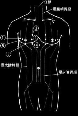 胸 部1 天池 2 神封 3 靈墟 4 步廊 5 天谿 6 乳根 |