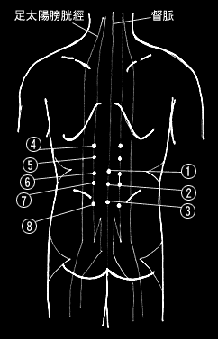 腰 部1 懸樞 2 命門 3 陽關 4 脾俞 5 胃俞 6 三焦俞 7 腎俞 8 大腸俞 |