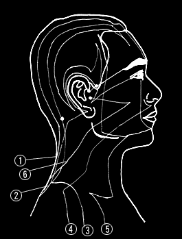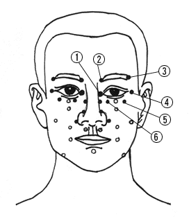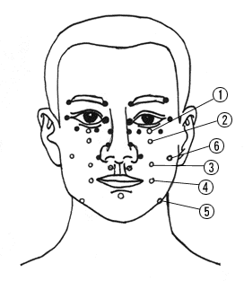 面 部1 承 泣 2 四 白 3 顴 髎 4 巨 髎 5 地 倉 6 大 迎 |