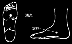 功效:膝蓋是預防風濕痛、關節炎、神經痛的病源。足三里是預防步行不疲倦、胃腸不好、食慾不佳、腎臟衰落、促進全身血液及五臟六腑達到適當的新陳代謝的功能。湧泉、然谷是增強體力。