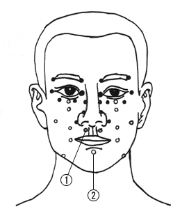 用法:首先將雙手之食指與中指互相摩擦發熱生電後,以右手之食指和中指放在上唇的1、禾膠,和下唇的2、承漿,左右橫推動循環摩擦三十六次。然後叩齒三十六次。 叩齒是上下齒相撞不是相咬也。