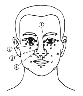 用法:首先將雙手之食指與中指互相摩擦發熱生電後,即刻將雙手食指放在鼻子的兩側,起在兩眉中間,再依順序1、睛明,2、上迎香,3、鼻通,4、迎香。上下來回循環摩擦推動三十六次。