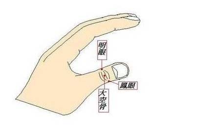 在我們的姆指上有三個相鄰接的穴道分別是明眼、鳳眼、大空骨(如上圖),明眼、鳳眼能夠改善眼睛疲勞和急性結膜炎,大空骨則可改善一切有關於眼睛的症狀。