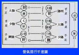 这上面讲的是营气的生成,生成什么?生成水谷精微之气,清者为营,浊者为卫,它们的运行“昼行于阳,夜行于阴”,各二十五度,昼夜五十周于身。夜半子时,营卫二气大会于阴,后边有,大会什么阴?大会手太阴。本段还没有讲大会于什么地方。
