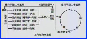 卫气运行在《内经》里记载更复杂,它这规律是挺复杂的,我们归纳一下,归纳认为有三个方面,它的运行规律有三个。